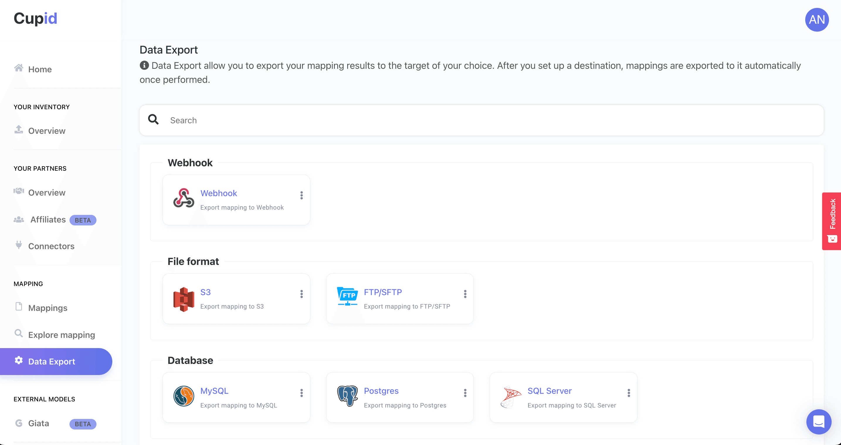 Automation: Our platform simplifies the mapping process by offering direct exports to your database, scheduled mapping processes, direct connections to suppliers, and automatic update scheduling. Cupid automates numerous repetitive and time-consuming tasks, saving time and freeing up human resources for your business operations.