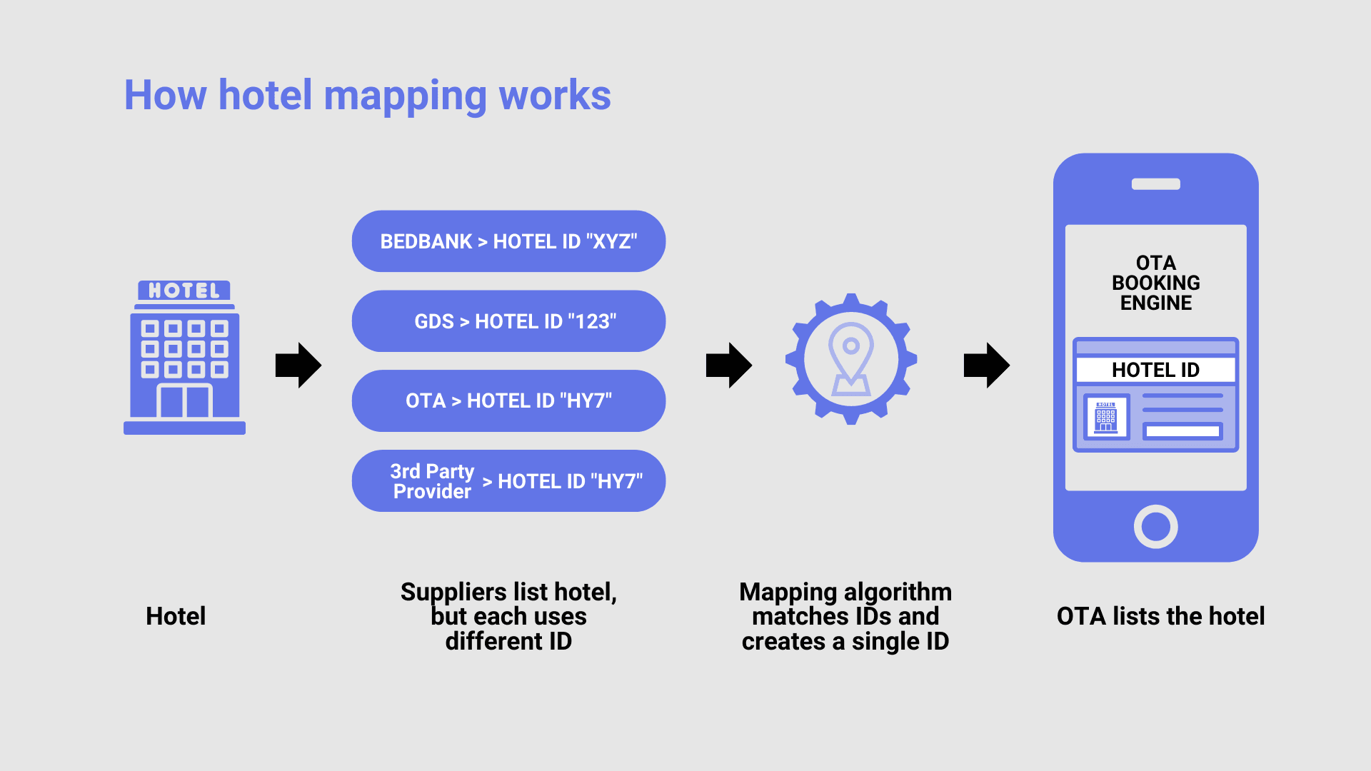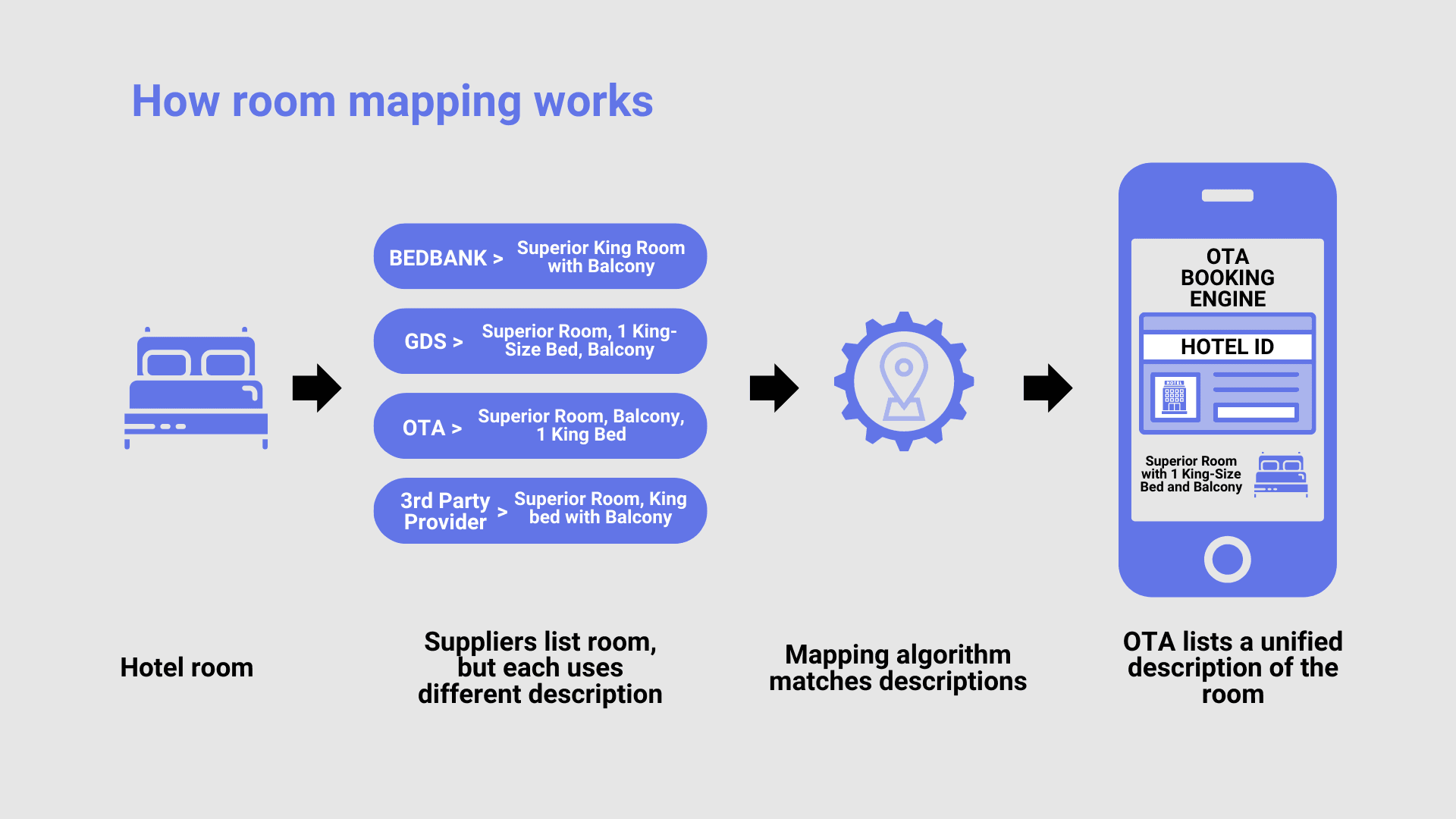 To understand room mapping, we first need to briefly touch upon its counterpart – hotel mapping. As Online Travel Agents (OTAs) collect hotel data from various sources like bed banks and global distribution systems, discrepancies arise. Different sources may list the same hotel under different IDs. The result? Customers see repeated listings, causing confusion. Hotel mapping works to aggregate these listings, removing duplicates and providing clarity.